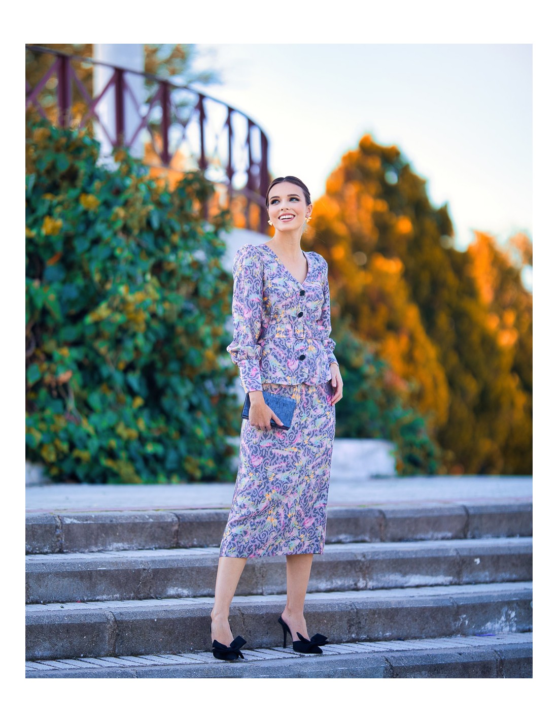 Blouse d'invité imprimée avec manches bouffantes et ceinture doublée dans le même tissu. Un modèle spectaculaire avec une encolure en V, des boutons bijoux sur le devant et aux poignets. Grâce à sa ceinture, elle est stylisée et devient un vêtement très flatteur. Réalisée dans un beau tissu avec un subtil fil de lurex dans un ton rose pâle. En l'associant à la jupe droite du même tissu, vous obtiendrez un ensemble très polyvalent que vous pourrez porter en différentes occasions et séparément.