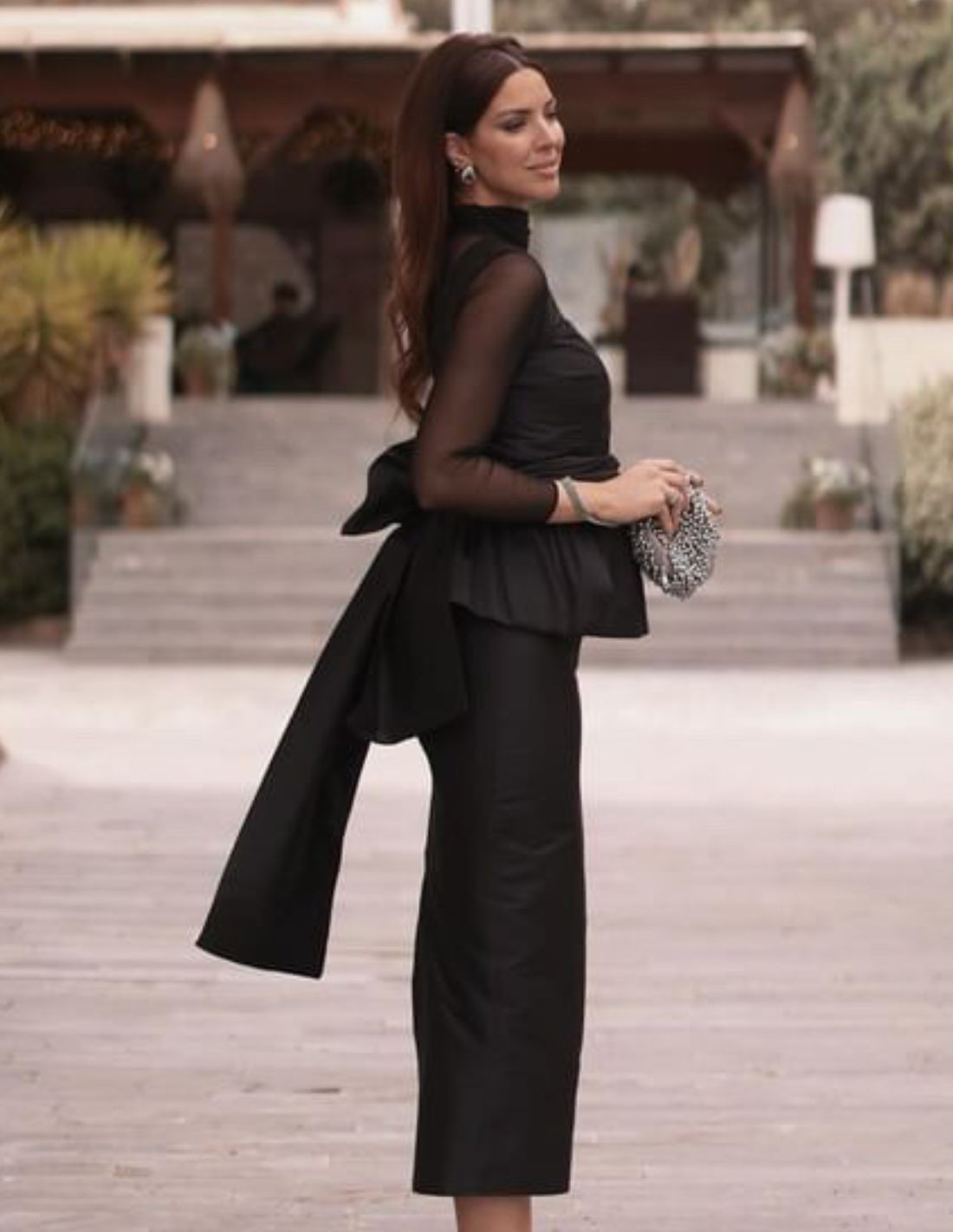 Elle est accompagnée d'un foulard en taffetas noir qui peut être porté de différentes manières : comme ceinture avec un nœud pour rehausser la taille ou comme accessoire élégant autour du cou ou des épaules.
