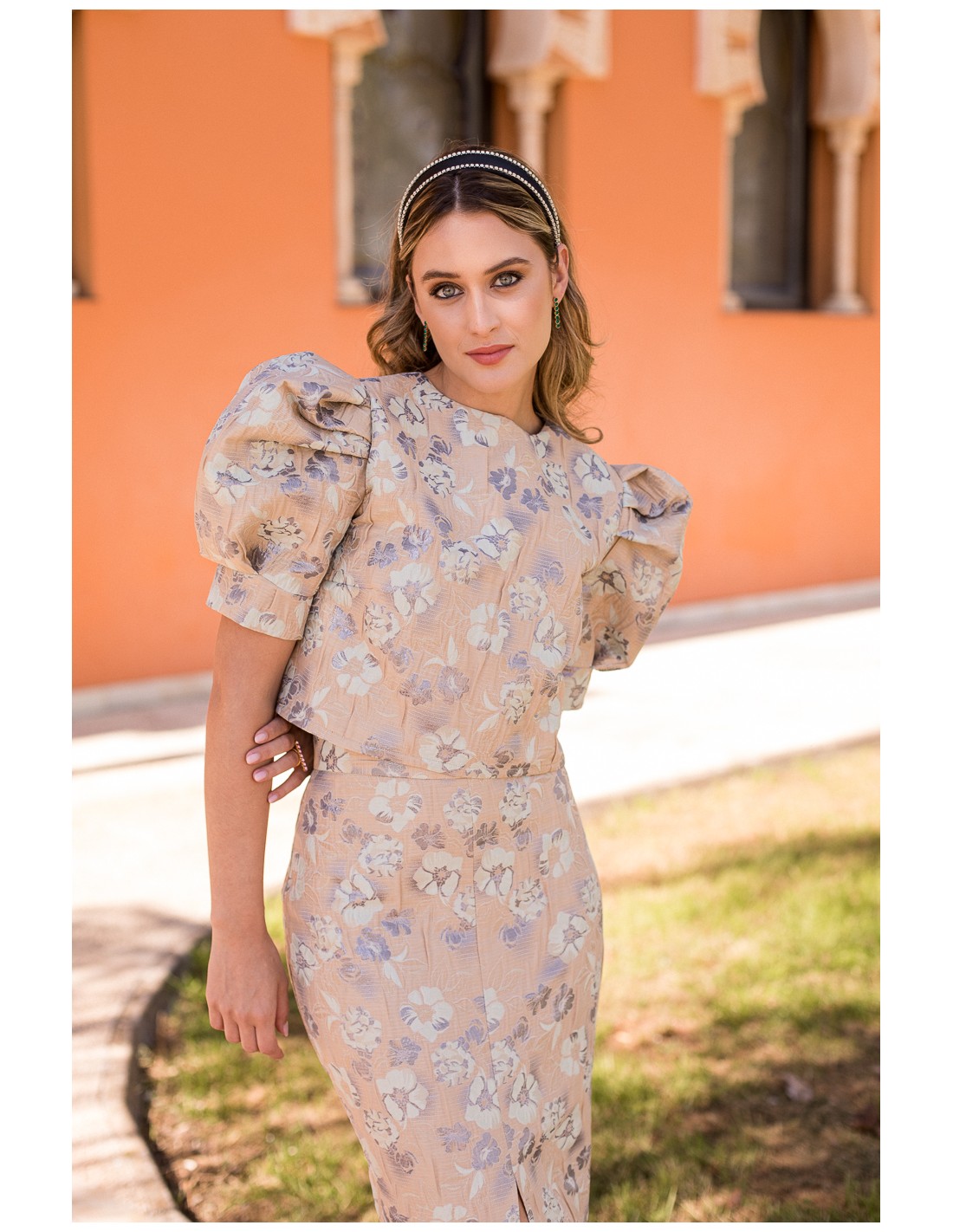 Une pièce vibrante et féminine qui ne passera pas inaperçue, ce top en brocart floral dans les tons or, vert d'eau et lilas est élégant et sophistiqué. Le brocart floral apporte texture, brillance et élégance, tandis que les manches coudées au volume subtil apportent une touche de modernité et de raffinement.