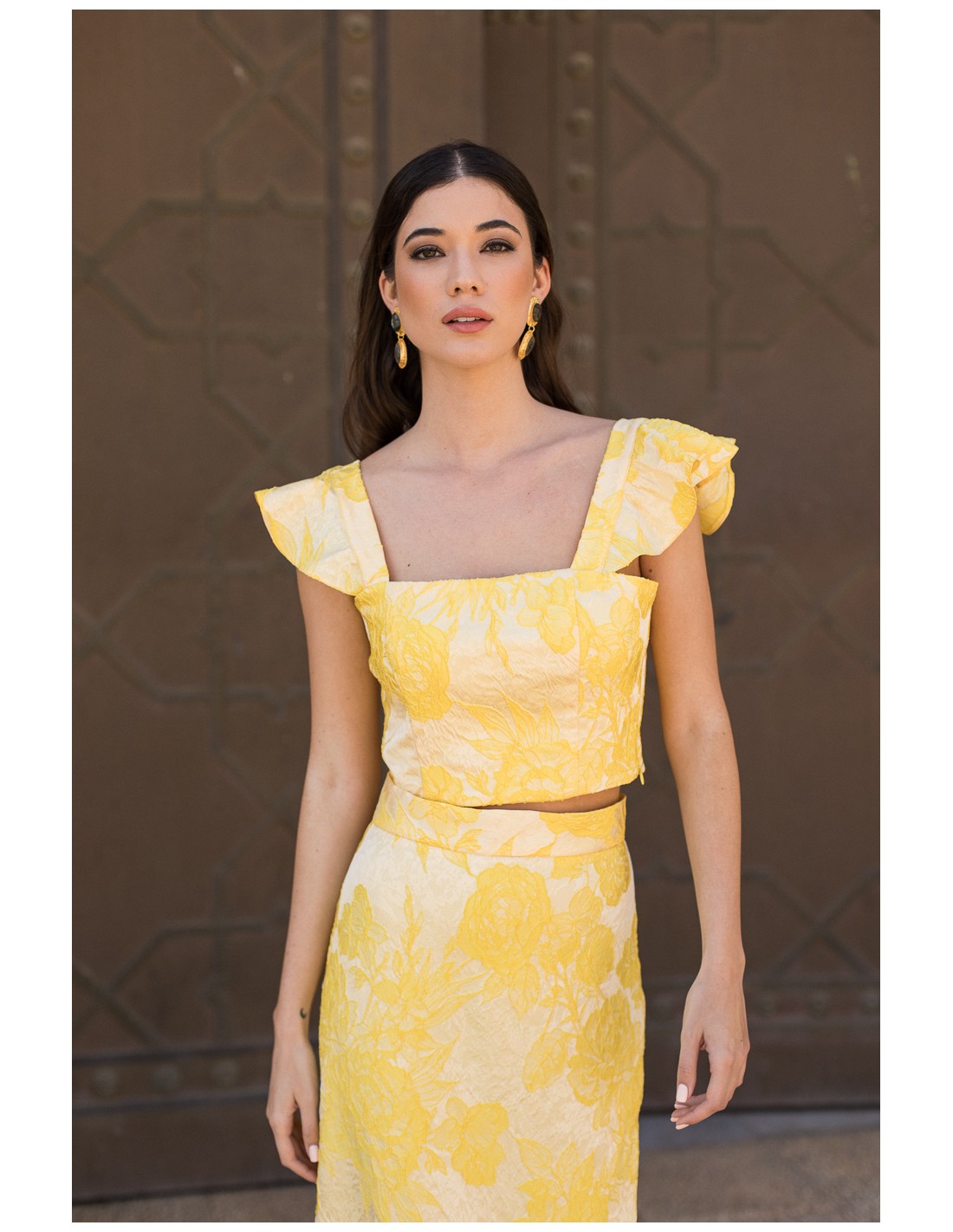 Ce haut de soirée jaune imprimé est une pièce lumineuse et sophistiquée, parfaite pour faire une déclaration élégante lors d'un événement spécial. Son tissu broché spectaculaire lui confère texture et élégance, tandis que la bretelle à volants apporte une touche romantique et originale.