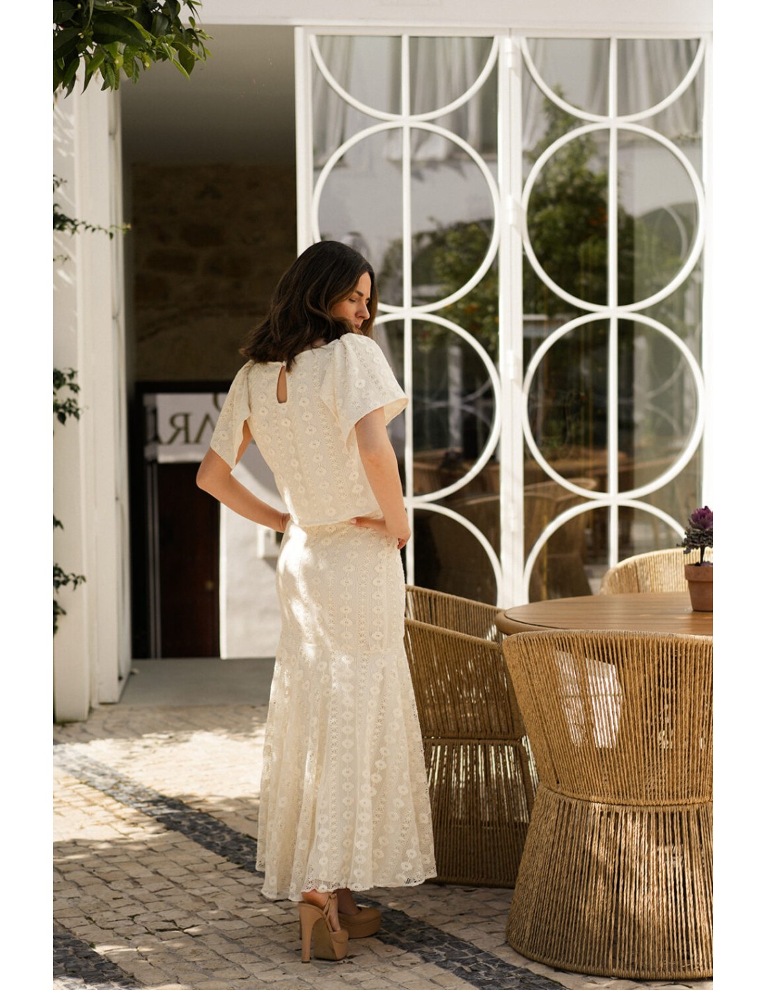 Ce top en macramé écru à manches courtes ouvertes est une pièce délicate, féminine et polyvalente. Fabriqué en 100 % coton et doublé de crêpe pour plus de confort, son design romantique et fluide en fait un choix idéal pour les événements de jour, les célébrations en plein air ou les looks d'été sophistiqués.