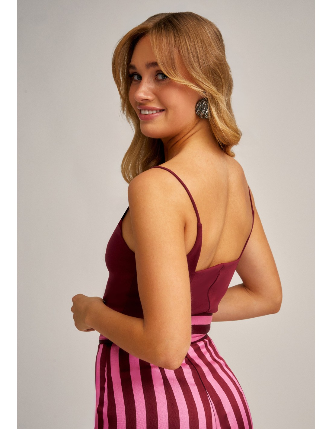 Ce top en maille bordeaux allie élégance, confort et design contemporain. Son encolure carrée souligne subtilement le buste, tandis que les fines bretelles apportent une touche féminine et sophistiquée. Les coutures italiennes flatteuses pour la silhouette assurent une coupe élégante et flatteuse. La fermeture éclair à l'ourlet central du dos ajoute un détail fonctionnel et moderne, complétant ainsi un modèle qui allie style et praticité.