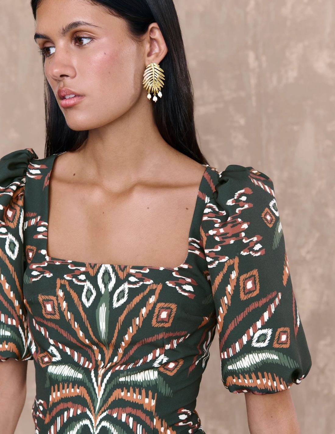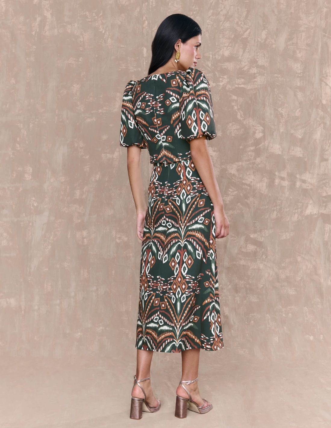 Ce haut pour invités, associé à la jupe qui complète l'ensemble, est la tenue idéale pour celles qui optent pour le confort lors d'un événement. Un haut en tissu imprimé vert, avec des manches bouffantes et une encolure carrée encadrant le cou. Idéal pour tous les événements tels que les mariages en journée ou en soirée, ou même pour combiner avec d'autres vêtements pour un look décontracté.