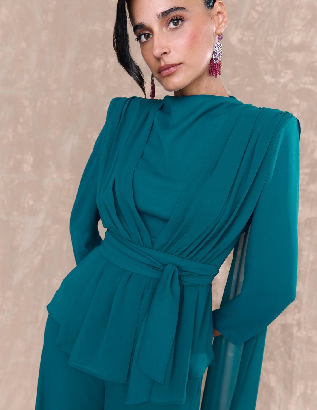 Si vous faites partie de ces invités qui misent sur des costumes de veste ou de chemisier pour tout type d'événement, ce costume se compose de ce chemisier de couleur pétrole, réalisé en georgette de texture fluide, avec des manches longues et un décolleté fermé et une mousseline drapée du même ton qui tombe avec fluidité des épaules à la ceinture ; et se compose de son pantalon qui complète l'ensemble.