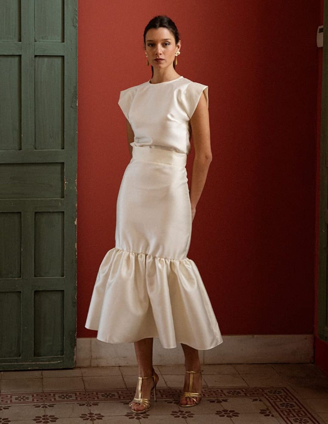 Haut de page de mikado à couleur écru, conçu pour ceux qui recherchent l'élégance avec a touche contemporaine. Fabriqué chez a tissu tissu structuré y légèrement satin, ce top se distingue par son drapé impeccable y son finition finition sophistiquée.