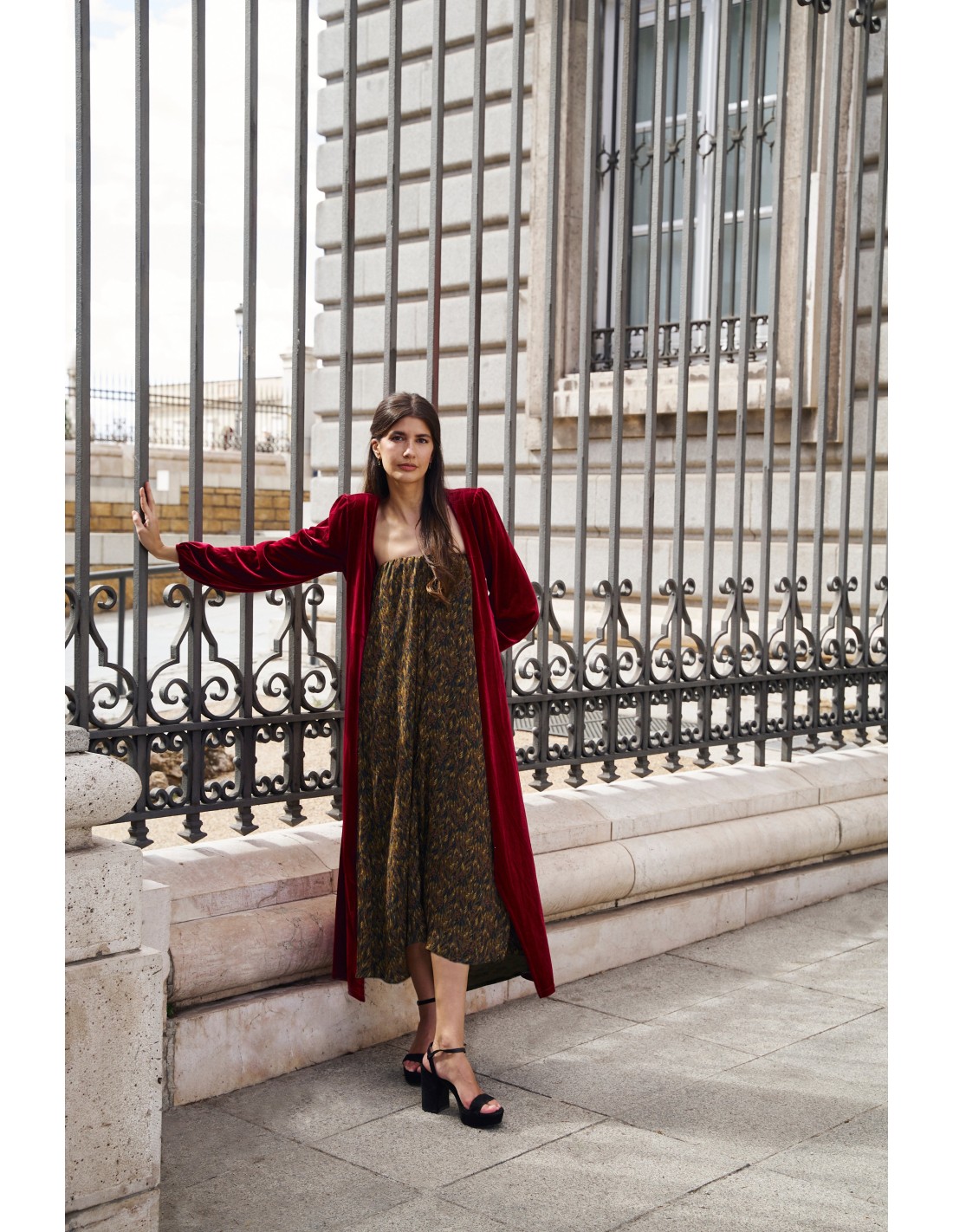 Manteau midi en velours rouge avec encolure croisée