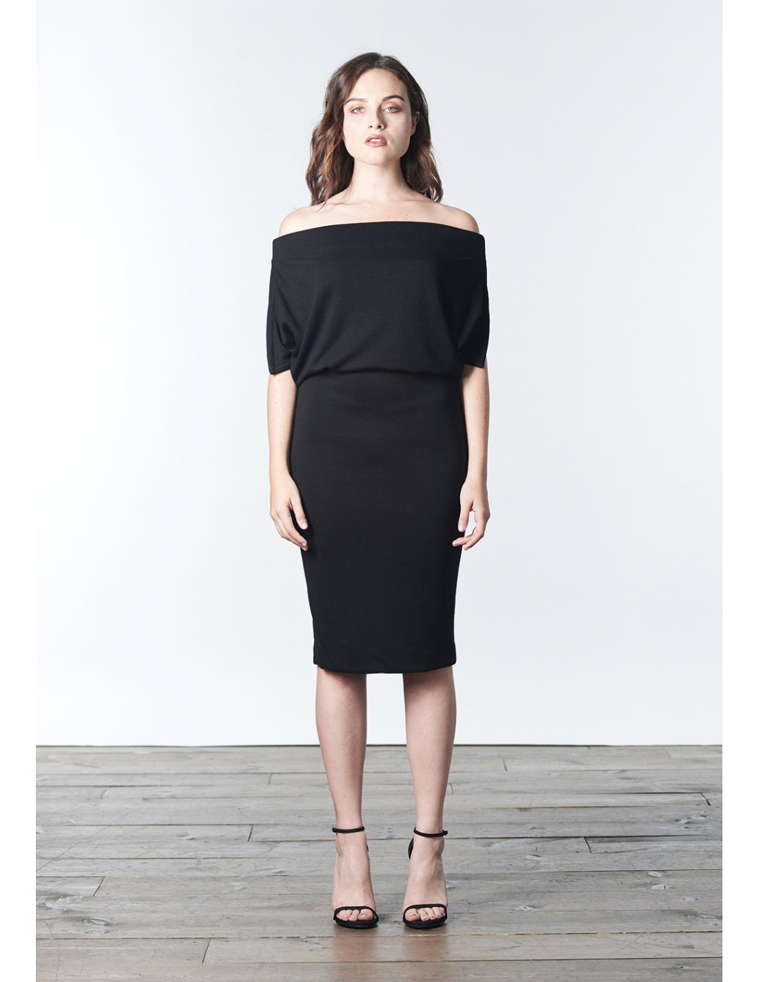 Cette robe midi est fabriquée à partir d'une maille Tencel épaisse et durable, conçue pour être portée de trois façons : épaule ouverte, asymétrique à une épaule ou surélevée, évoquant le style classique d'Audrey Hepburn. Cette robe associe une coupe étroite au niveau des hanches à un design blousant au niveau du corsage, mettant en valeur les courbes naturelles des épaules.